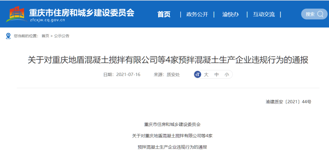 重慶地盾混凝土攪拌有限公司、重慶市榮昌區(qū)宏昌商品混凝土有限公司、重慶品信建筑材料有限公司、重慶正能實業(yè)有限公司等4家預(yù)拌混凝土生產(chǎn)企業(yè)未切實履行生產(chǎn)質(zhì)量責(zé)任,未按相關(guān)法律、法規(guī)和工程建設(shè)強制性標準開展預(yù)拌混凝土質(zhì)量控制工作,重慶市住房和城鄉(xiāng)建設(shè)委員會決定予以全市通報批評,記入不良信用信息六個月。