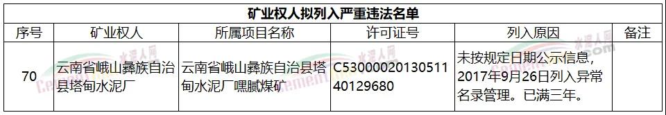 據(jù)水泥人網(wǎng)了解,此前,云南省自然資源廳發(fā)布《礦業(yè)權(quán)人擬列入嚴(yán)重違法名單公示》,其中,云南省峨山彝族自治縣塔甸水泥廠因未按規(guī)定日期公示信息,2017年9月26日列入異常名錄管理,已滿三年,被列入嚴(yán)重違法名單。具體如下: