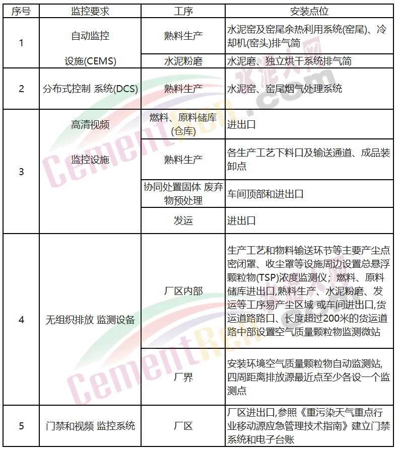 建設全廠污染物排放管、控、治一體化監(jiān)控平臺,全面加強自動監(jiān)控、過程監(jiān)控和視頻監(jiān)控設施建設。窯尾(含氨逃逸在線監(jiān)測)、窯頭、獨立烘干系統(tǒng)、水泥磨等均安裝自動監(jiān)控設施(CEMS)。水泥窯、窯尾煙氣處理系統(tǒng)均應安裝分布式控制系統(tǒng)(DCS)。原料儲庫、成品裝卸平臺及輸送通道等重點工序安裝高清視頻監(jiān)控設施。廠區(qū)內主要產塵點周邊、運輸道路兩側安裝空氣質量顆粒物監(jiān)測設施,廠界安裝環(huán)境空氣質量顆粒物自動監(jiān)測站。建設門禁系統(tǒng)和視頻監(jiān)控系統(tǒng),監(jiān)控運輸車輛進出廠區(qū)情況。DCS、CEMS監(jiān)控等數據至少保存一年以上,視頻監(jiān)控數據至少保存半年以上。上述監(jiān)測監(jiān)控設施隨治理設施同步建設或完善。具體要求見附件2。