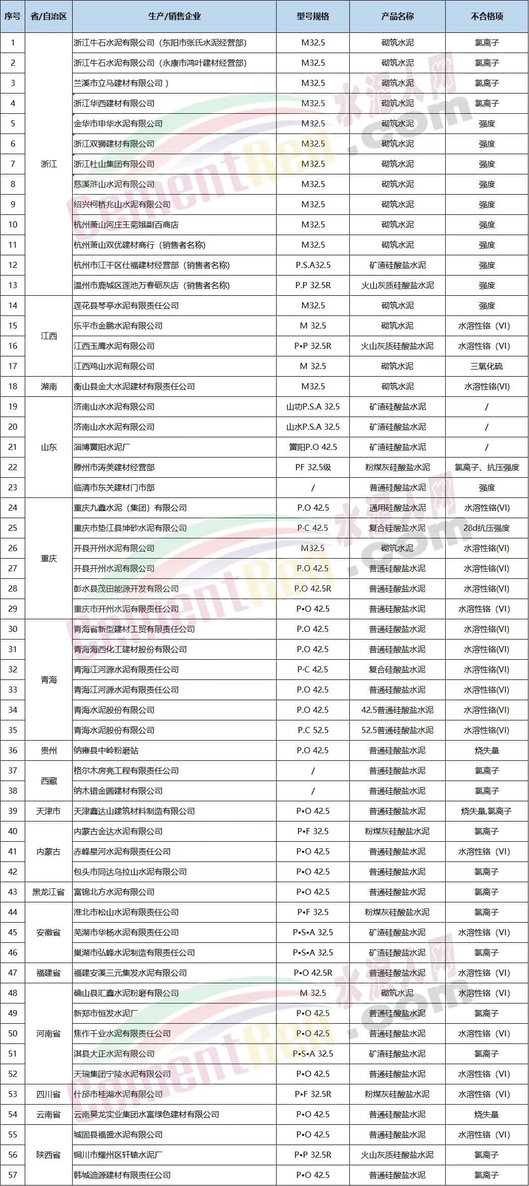 然而,當(dāng)前市場(chǎng)上的水泥質(zhì)量并不樂(lè)觀。據(jù)水泥人網(wǎng)不完全統(tǒng)計(jì),僅2021年以來(lái),各地市場(chǎng)監(jiān)管局通報(bào)的水泥質(zhì)量不合格企業(yè)就多達(dá)57家,通報(bào)的不合格水泥不僅包括32.5等級(jí)標(biāo)號(hào)水泥也包括42.5等級(jí)的普通硅酸鹽水泥,不合格項(xiàng)目更是涉及到了抗壓、抗折強(qiáng)度、三氧化硫、氯離子、燒失量、水溶性鉻(Ⅵ)等多個(gè)方面。2021年1月1日至今被各省市自治區(qū)市場(chǎng)監(jiān)管部門(mén)通報(bào)不合格水泥生產(chǎn)/銷售企業(yè)名單如下: