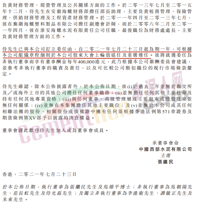 7月23日,西部水泥(02233)發(fā)布《非執(zhí)行董事變更公告》,《公告》稱(chēng),自2021年7月23日起:劉剡因工作安排調(diào)整而辭任非執(zhí)行董事。侍光磊已獲委任為非執(zhí)行董事。具體公告如下: