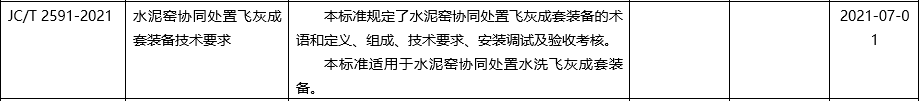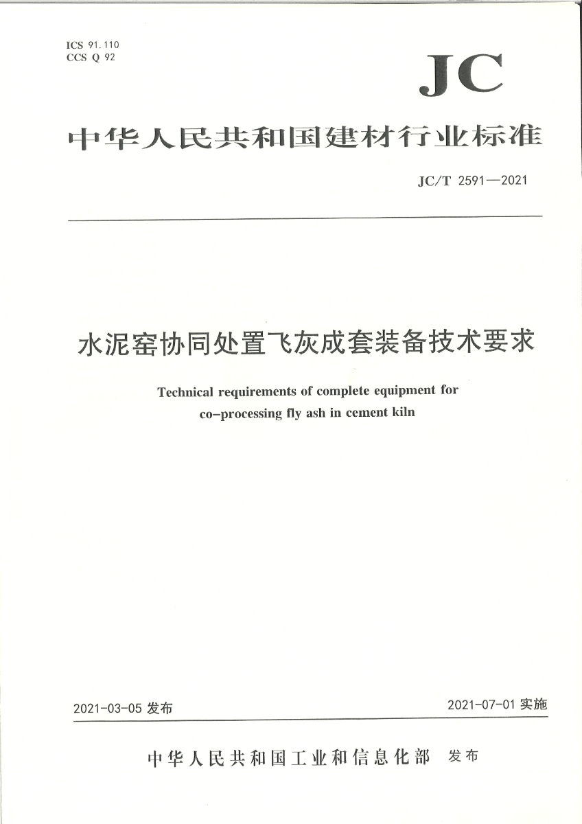 2021年4月19日,工業(yè)和信息化部發(fā)布了《中華人民共和國(guó)工業(yè)和信息化部公告2021年第6號(hào)》,批準(zhǔn)了563項(xiàng)行業(yè)標(biāo)準(zhǔn),其中北京中科國(guó)潤(rùn)環(huán)??萍加邢薰緺款^,北京金隅琉水環(huán)??萍加邢薰?、唐山冀東裝備工程有限公司、中國(guó)建材機(jī)械工業(yè)協(xié)會(huì)等多家單位制定的JC/T2591-2021《水泥窯協(xié)同處置飛灰成套裝備技術(shù)要求》行業(yè)標(biāo)準(zhǔn)正式發(fā)布,自2021年7月1日起正式實(shí)施。