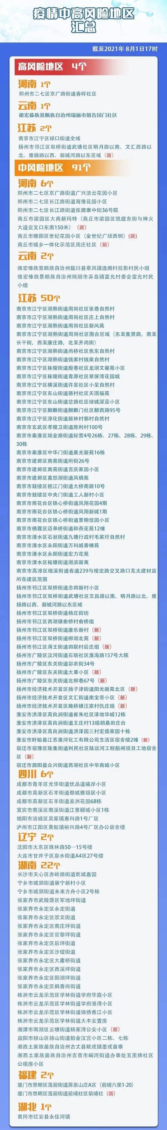 8月1日,據“揚州發(fā)布”微信公眾號消息,經揚州市新冠肺炎疫情防控工作指揮部研究,自8月1日起,對揚州市部分區(qū)域疫情風險等級進行調整,揚州市邗江區(qū)雙橋街道武塘社區(qū)明月路以南、文匯西路以北、維揚路以西、新城河路以東區(qū)域由中風險地區(qū)調整為高風險地區(qū);揚州市廣陵區(qū)東關街道大草小區(qū);揚州市廣陵區(qū)東關街道北柳巷67號;揚州市邗江區(qū)雙橋街道康樂新村等8個小區(qū)為中風險地區(qū)。