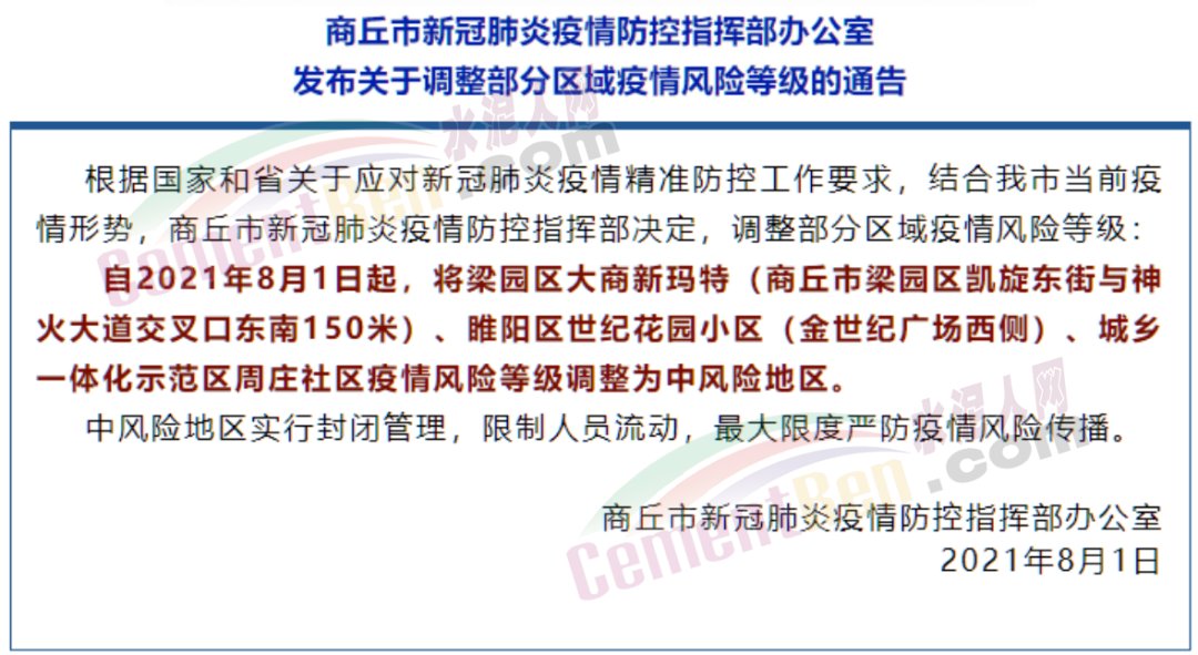 河南商丘市新冠肺炎疫情防控指揮部辦公室發(fā)布《商丘市新冠肺炎疫情防控指揮部辦公室發(fā)布關于調整部分區(qū)域疫情風險等級的通告》稱,自8月1日起,將梁園區(qū)大商新瑪特(商丘市梁園區(qū)凱旋東街與神火大道交叉口東南150米)、睢陽區(qū)世紀花園小區(qū)(金世紀廣場西側)、城鄉(xiāng)一體化示范區(qū)周莊社區(qū)疫情風險等級調整為中風險地區(qū)。中風險地區(qū)實行封閉管理,限制人員流動,最大限度嚴防疫情風險傳播。