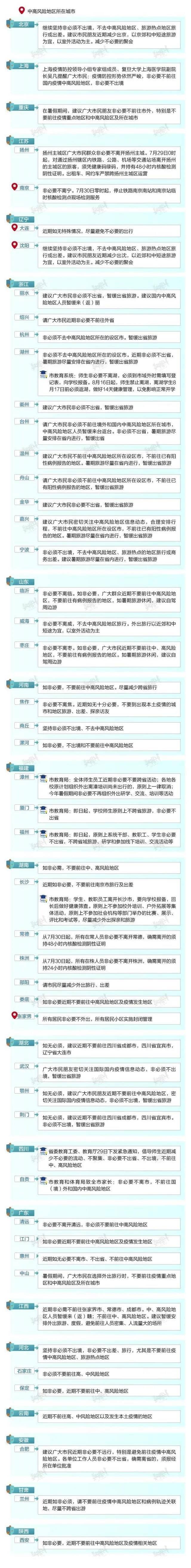 據不完全統(tǒng)計,截至7月30日18時,全國共有19個?。ㄗ灾螀^(qū)、直轄市)發(fā)布53條疫情防控出行提醒,涉及46個城市。其中,29個省市提醒市民“非必要不出省、不離市”或“減少出省、出市”,占全部出行提醒數量的5成以上。超7成省市提到"不去中高風險地區(qū)",有5成省市建議市民"暫緩出省旅游"或選擇“周邊游”。浙江、福建、湖南、四川I4省部分城市的教育系統(tǒng)均對暑期師生防疫工作提出嚴格要求,取消相關的外出交流、培訓活動。
