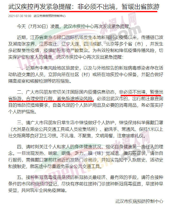 7月31日,湖北疾控連續(xù)發(fā)出多個緊急提示,鑒于當前的疫情形勢,如無必須,建議近期不要前往河南省鄭州市、江蘇省淮安市、湖南省株洲市、湘西州及黃岡市紅安縣。