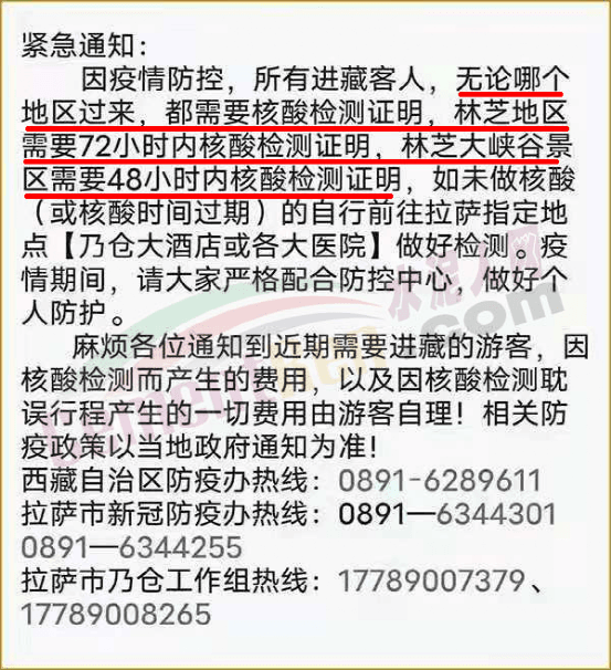 西藏地區(qū)緊急通知∶因疫情防控,所有進藏客人,無論哪個地區(qū)過來,都需要核酸檢測證明,林芝地區(qū)需要72小時內核酸檢測證明,林芝大峽谷景區(qū)需要48小時內核酸檢測證明,如未做核酸(或核酸時間過期)的自行前往拉薩指定地點做好檢測。