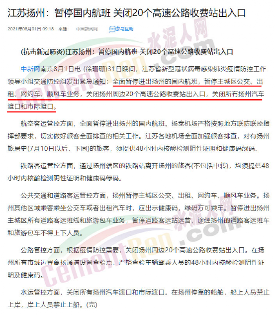 7月31日晚間,江蘇省新型冠狀病毒感染肺炎疫情防控工作領導小組交通防控組發(fā)出緊急通知:全面暫停進出揚州的國內航班,暫停主城區(qū)公交、出租、網約車、順風車業(yè)務,關閉揚州周邊20個高速公路收費站出入口,關閉所有揚州汽車渡口和市際渡口。