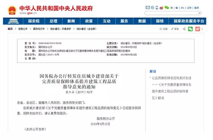 2019年國務院辦公廳發(fā)布了關于完善質(zhì)量保障體系提升建筑工程品質(zhì)指導意見,明確要求,推進工程質(zhì)量管理標準化,將質(zhì)量管理要求落實到每個項目和員工。建立質(zhì)量責任標識制度,對關鍵工序、關鍵部位隱蔽工程實施舉牌驗收,加強施工記錄和驗收資料管理,實現(xiàn)質(zhì)量責任可追溯。