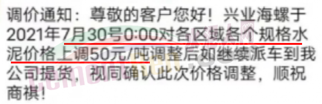 興業(yè)海螺通知自7月30日0時(shí)起對(duì)各區(qū)域各個(gè)規(guī)格水泥價(jià)格上調(diào)50元/噸,調(diào)整后如繼續(xù)派車(chē)到公司提貨,視同確認(rèn)此次價(jià)格調(diào)整。