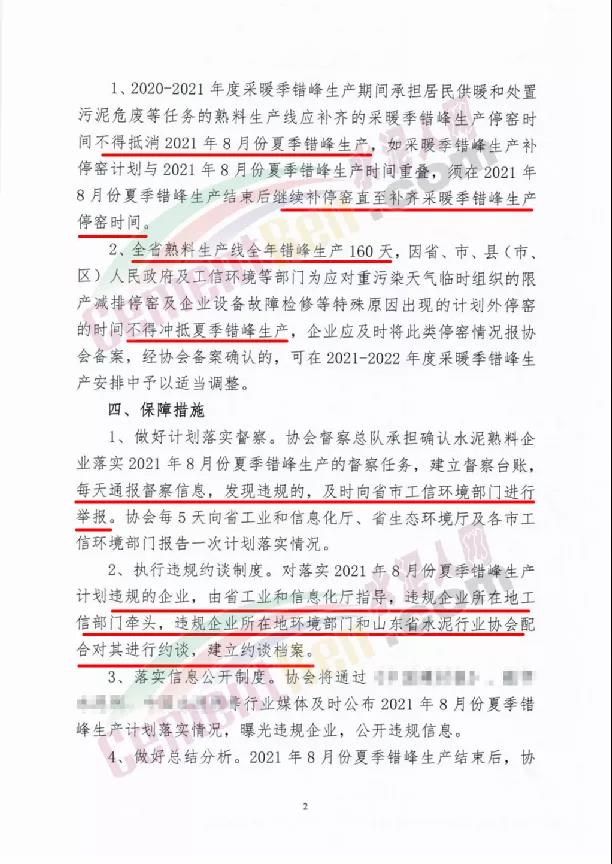 要求相關(guān)機(jī)構(gòu)做好計(jì)劃落實(shí)督察,發(fā)現(xiàn)違規(guī)的,及時(shí)向省市工信環(huán)境部門進(jìn)行舉報(bào)。同時(shí),執(zhí)行違規(guī)約談制度。對落實(shí)2021年8月份夏季錯(cuò)峰生產(chǎn)計(jì)劃違規(guī)的企業(yè),由省工業(yè)和信息化廳指導(dǎo),違規(guī)企業(yè)所在地工信部門牽頭,違規(guī)企業(yè)所在地環(huán)境部門和山東省水泥行業(yè)協(xié)會(huì)配合對其進(jìn)行約談,建立約談檔案。