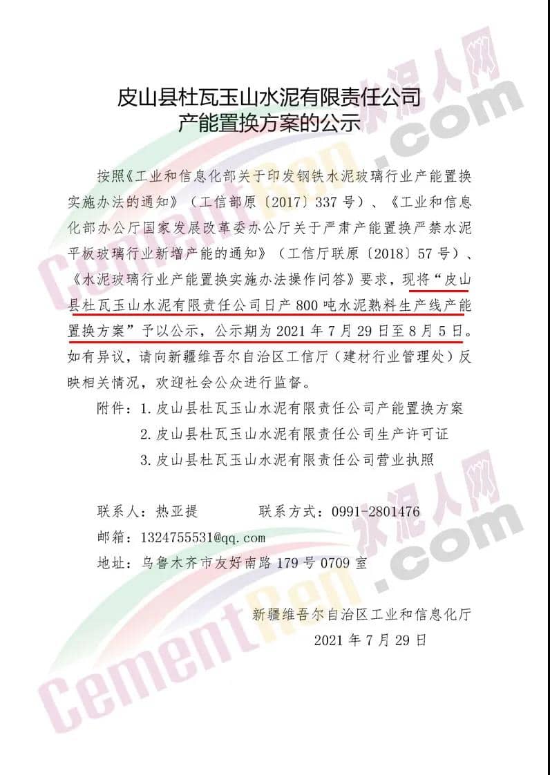 7月29日,新疆工信廳發(fā)布《皮山縣杜瓦玉山水泥有限責(zé)任公司產(chǎn)能置換方案公示》,方案中明確皮山縣杜瓦玉山水泥有限責(zé)任公司將出讓800t/d熟料產(chǎn)能給圖木舒克市中科建材股份有限公司,用于將新建一條2533t/d新型干法水泥熟料生產(chǎn)線,置換比例為1.5:1,新建生產(chǎn)線擬于2023年7月點(diǎn)火投產(chǎn),公示期為7月29日至8月5日。