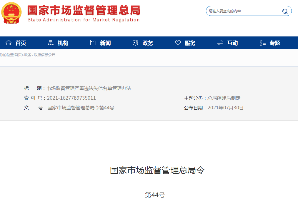 8月2日,國(guó)家市場(chǎng)監(jiān)督管理總局發(fā)布了第44號(hào)總局令稱,《市場(chǎng)監(jiān)督管理嚴(yán)重違法失信名單管理辦法》已經(jīng)2021年7月22日市場(chǎng)監(jiān)管總局第11次局務(wù)會(huì)議審議通過(guò),現(xiàn)予公布,自2021年9月1日起施行。
