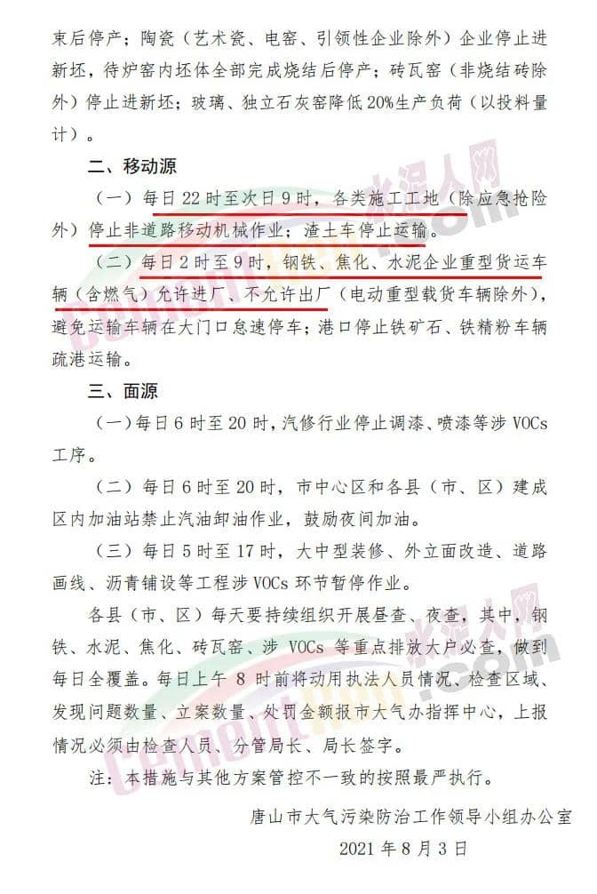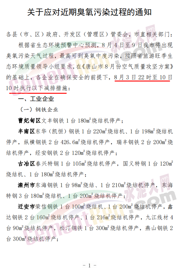 8月3日唐山市發(fā)布《關(guān)于應(yīng)對(duì)近期臭氧污染過程的通知》稱,8月3日22時(shí)至10日10時(shí)執(zhí)行減排措施: