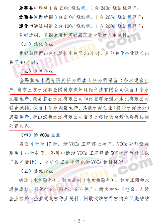 唐山飛龍水泥有限責(zé)任公司、唐山燕東水泥股份有限公司、唐山耀東水泥有限公司、唐山弘也水泥有限公司、唐山圣龍水泥有限公司等5家B級(jí)企業(yè)停產(chǎn)15天;