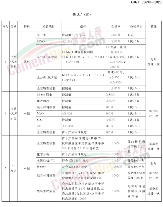 標(biāo)準(zhǔn)附錄中給出了出磨/入庫(kù)水泥以及出廠水泥質(zhì)量檢驗(yàn)項(xiàng)目、指標(biāo)、檢驗(yàn)頻次和取樣方式要求。