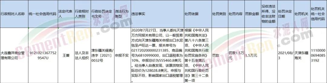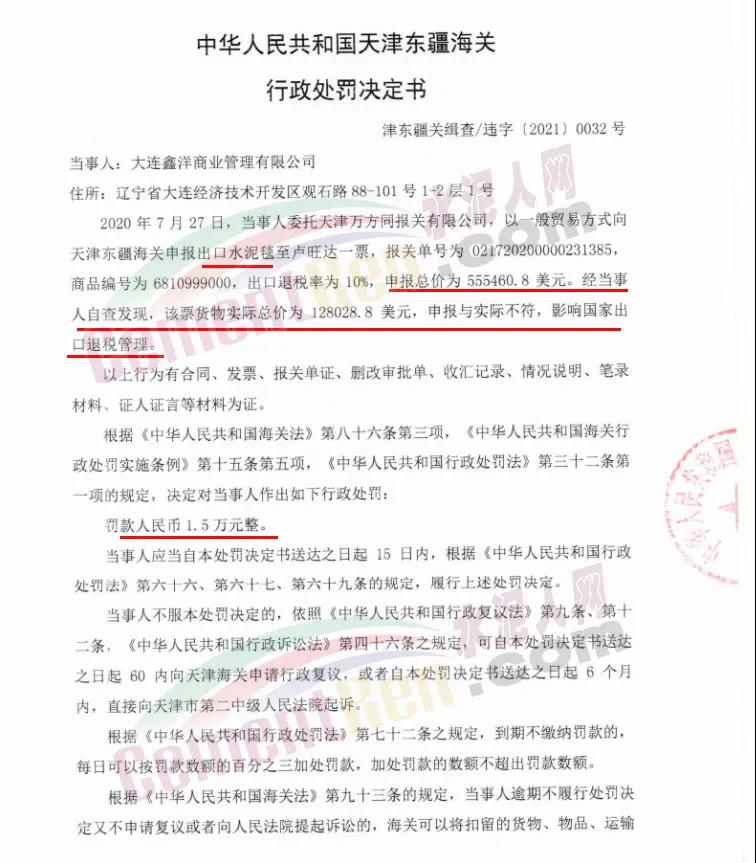 日前天津海關發(fā)布行政處罰決定書,其中提到出口水泥毯申請與實際不符,影響國家出品退稅管理被處罰人民幣1.5萬元。