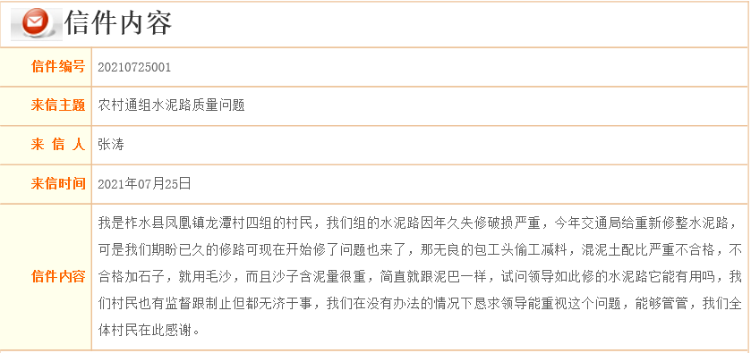 日前,有村民有陜西省商洛政府網(wǎng)市長(zhǎng)信箱留言反應(yīng)農(nóng)村通組水泥路質(zhì)量問題稱:“我是柞水縣鳳凰鎮(zhèn)龍?zhí)洞逅慕M的村民,我們組的水泥路因年久失修破損嚴(yán)重,今年交通局給重新修整水泥路,可是我們期盼已久的修路可現(xiàn)在開始修了問題也來(lái)了,那無(wú)良的包工頭偷工減料,混凝土配比嚴(yán)重不合格,不合格加石子,就用毛沙,而且沙子含泥量很重,簡(jiǎn)直就跟泥巴一樣,試問領(lǐng)導(dǎo)如此修的水泥路它能有用嗎,我們村民也有監(jiān)督跟制止但都無(wú)濟(jì)于事,我們?cè)跊]有辦法的情況下懇求領(lǐng)導(dǎo)能重視這個(gè)問題,能夠管管,我們?nèi)w村民在此感謝。”