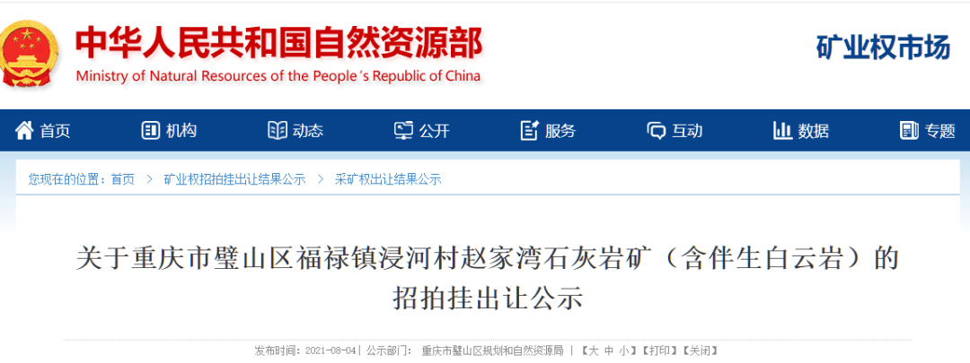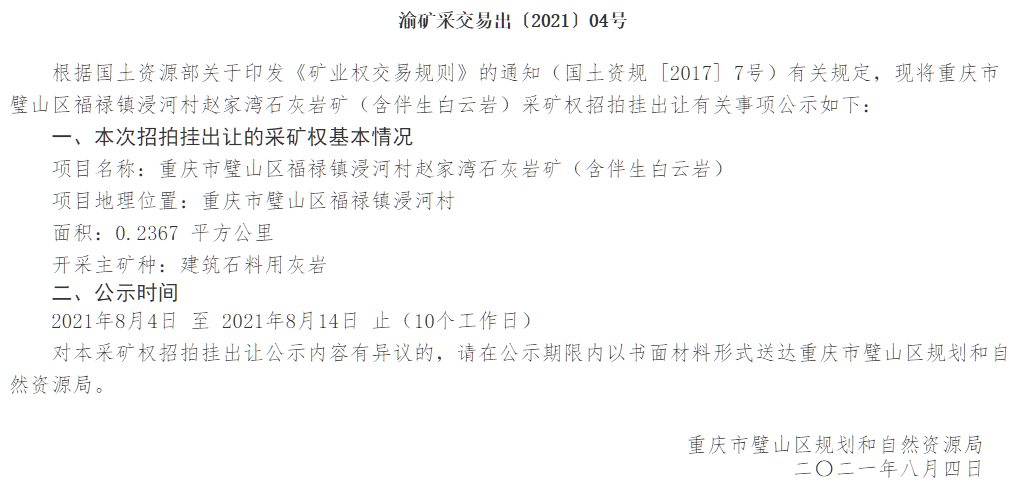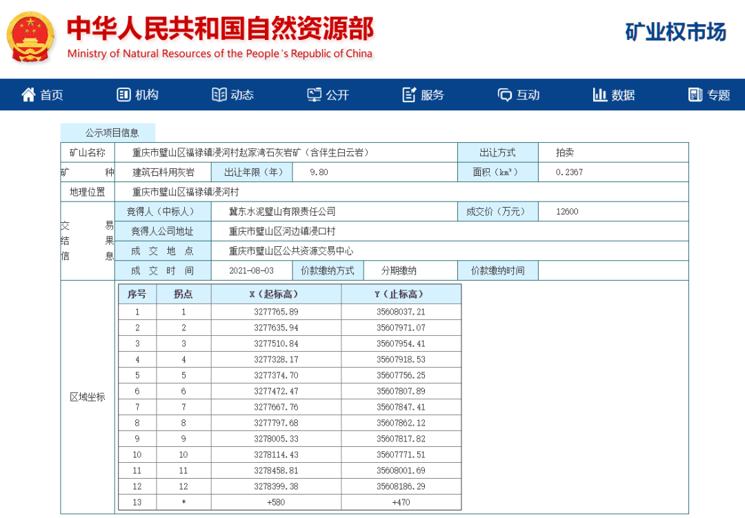 8月4日,中華人民共和國自然資源部發(fā)布《關于重慶市璧山區(qū)福祿鎮(zhèn)浸河村趙家灣石灰?guī)r礦(含伴生白云巖)的招拍掛出讓公示》。公示文件顯示,中標人采礦權中標人為冀東水泥璧山有限責任公司,成交價為12600萬元,成交時間為2021年8月3日。