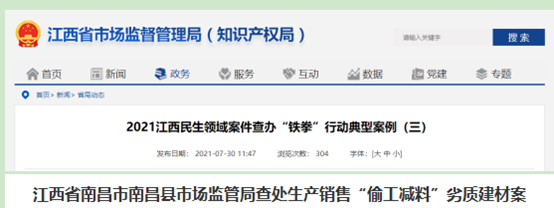 7月30日江西省市場監(jiān)督管理局發(fā)布了2021江西民生領域案件查辦“鐵拳”行動典型案例其中提到一起劣質(zhì)建材案。