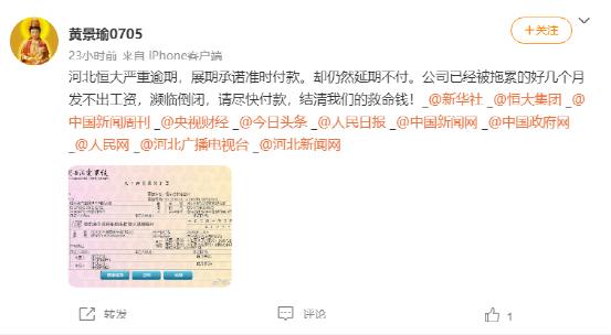 另一網(wǎng)友提到,“河北恒大嚴(yán)重逾期,展期承諾準(zhǔn)時(shí)付款,卻仍然延期不付,公司已經(jīng)被拖累好幾個(gè)月發(fā)不出工資,瀕臨倒閉。”
