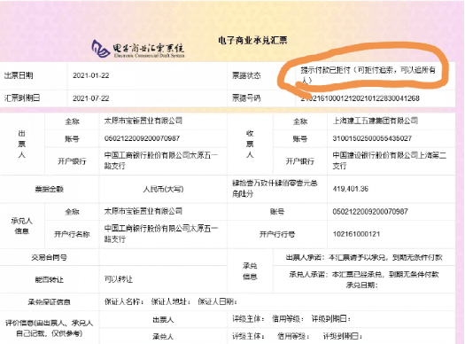 同時(shí),其還曬出了兩份商業(yè)承兌匯票的截圖,金額分別為40多萬和10多萬,出票人均顯示為太原市寶鉅置業(yè)有限公司,出票時(shí)間為2021年1月22日,到期日為2021年7月22日。票據(jù)狀態(tài)為“提示付款已拒付”。