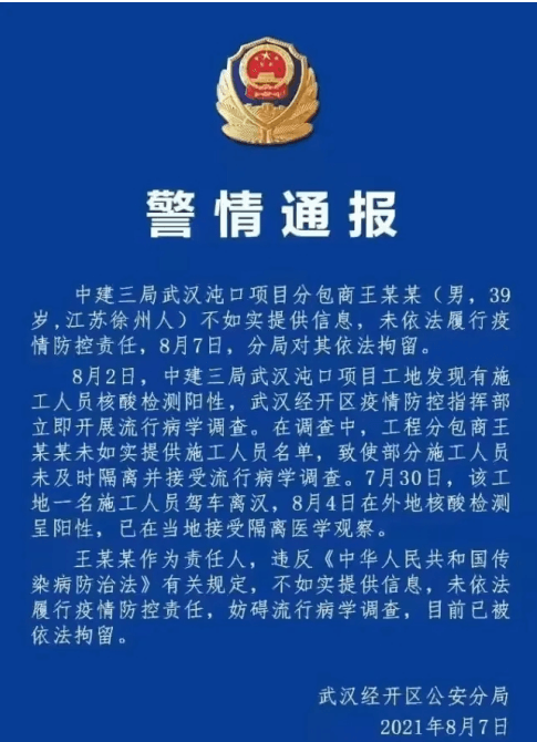 8月7日,武漢經(jīng)開區(qū)公安分局發(fā)布警情通報:中建三局武漢沌口項目分包商王某某未如實提供信息,未依法履行疫情防控責(zé)任,8月7日,分局對其依法拘留。