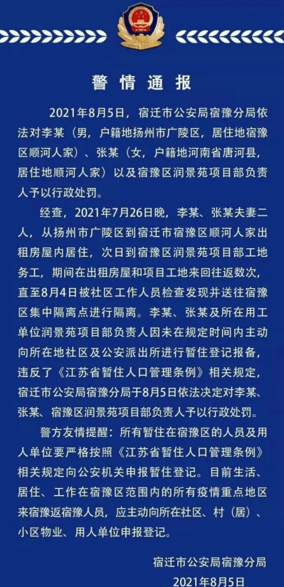 8月4日,宿豫區(qū)的社區(qū)工作人員在檢查中發(fā)現(xiàn),當(dāng)?shù)赜幸粚Ψ蚱拊?月26日曾從揚州市廣陵區(qū)返回宿豫,其間一直沒有上報行程,甚至還堂而皇之地到附近工地務(wù)工。李某、張某和所在用工單位潤景苑項目部負(fù)責(zé)人因未在規(guī)定時間內(nèi)主動向所在地社區(qū)及公安派出所進(jìn)行暫住登記報備,違反了《江蘇省暫住人口管理條例》相關(guān)規(guī)定,警方已于8月5日依法對他們3人予以行政處罰。