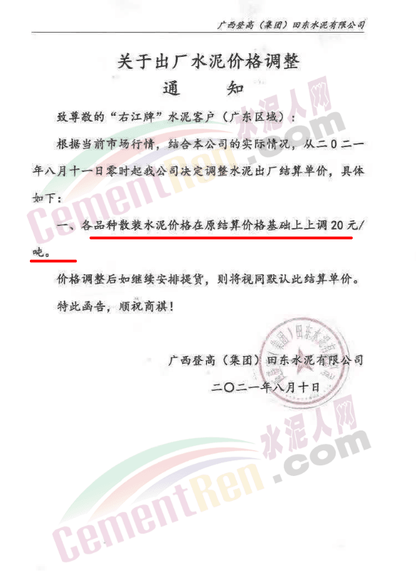 水泥人網(wǎng)通訊員消息:8月10日,廣西登高(集團(tuán))田東水泥有限公司通知根據(jù)當(dāng)前市場行情,結(jié)合公司的實際情況,從8月11日零時起公司決定調(diào)整廣東區(qū)域水泥出廠結(jié)算單價。各品種散裝水泥價格在原結(jié)算價格基礎(chǔ)上上調(diào)20元/噸。價格調(diào)整后如繼續(xù)安排提貨。