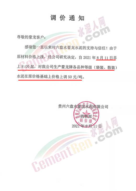 近日,受限電及煤炭漲價影響,一直處于水泥洼地的貴州省內(nèi)水泥價格大幅上漲。貴州六盤水豪龍水泥有限公司通知自8月11日早8時起,對公司生產(chǎn)的豪龍牌各等級(袋裝、散裝)水泥在原價基礎(chǔ)上上調(diào)50元/噸。