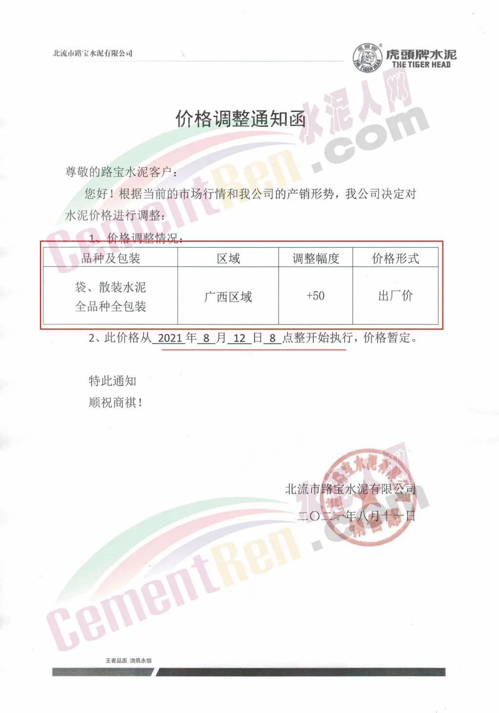 根據(jù)近期市場形勢,我司決定于2021年8月13日00:00起,對全廣西區(qū)域的全品項水泥價格上調(diào)50元/噸。