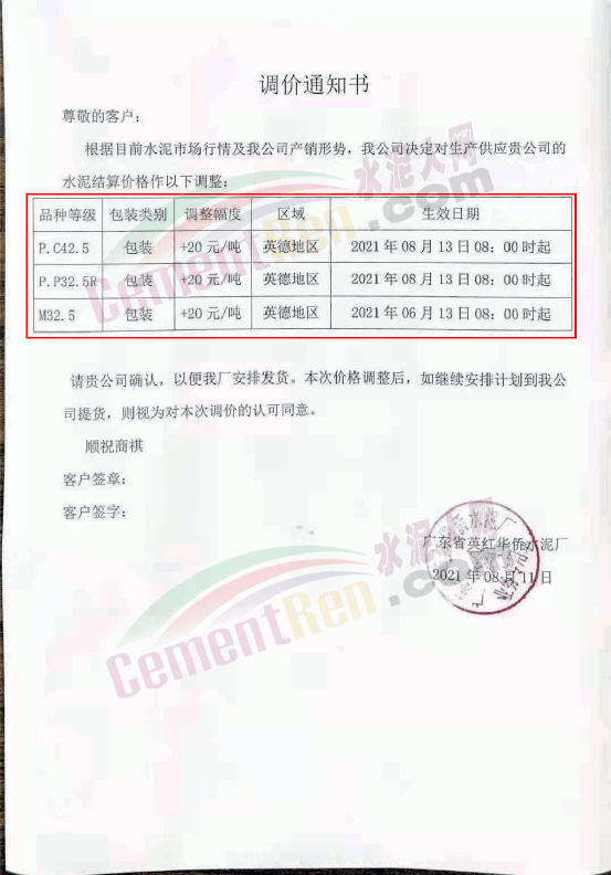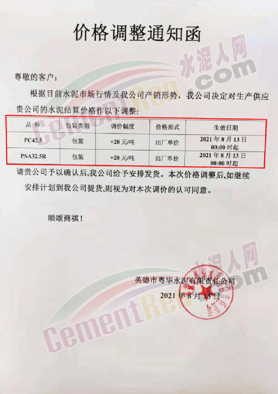 英德市粵華水泥有限責(zé)任公司通知自8月13日0時起,公司旗下PC42.5包裝及PSA32.5R包裝水泥出廠價上調(diào)20元/噸。