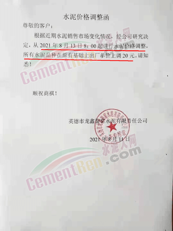 英德市龍鑫旋窯水泥有限責(zé)任公司通知,根據(jù)近期水泥銷售市場變化情況,經(jīng)公司研究決定自8月13日8時所有水泥品種在原有基礎(chǔ)上上調(diào)20元/噸。