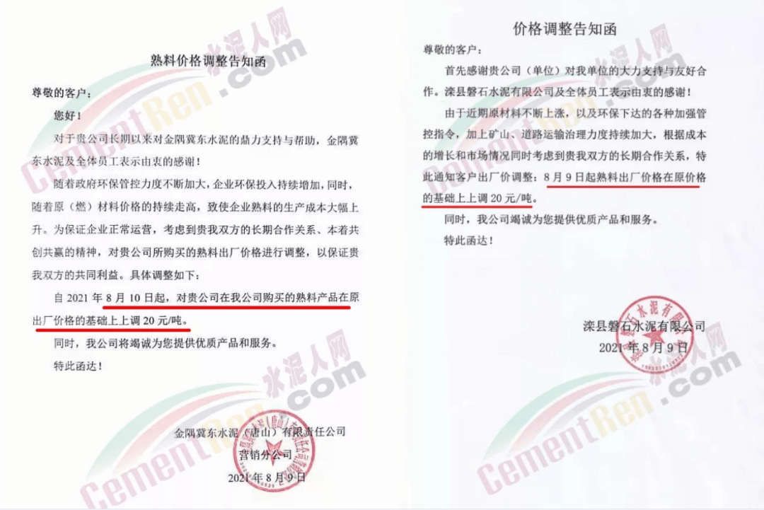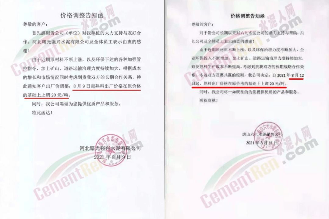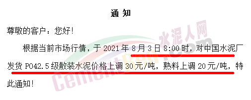 同期,水泥價格也出現(xiàn)跟漲。8月12日四川億鑫聯(lián)水泥有限公司通知,由于當(dāng)前市場變化情況,經(jīng)公司研究決定,自8月13日旱上7時起,對公司袋裝、散裝水泥在原價格基礎(chǔ)上上調(diào)50元/噸。價格調(diào)整后,如您繼續(xù)安排車輛到公司提貨,則視為確認(rèn)本次價格調(diào)整。