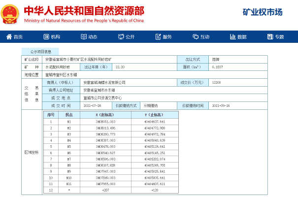 7月26日安徽宣城海螺水泥有限公司以12200萬元成交價(jià)中標(biāo)安徽省宣城市小葛村礦區(qū)水泥配料用砂巖礦0.1837km²采礦權(quán)22.2年。