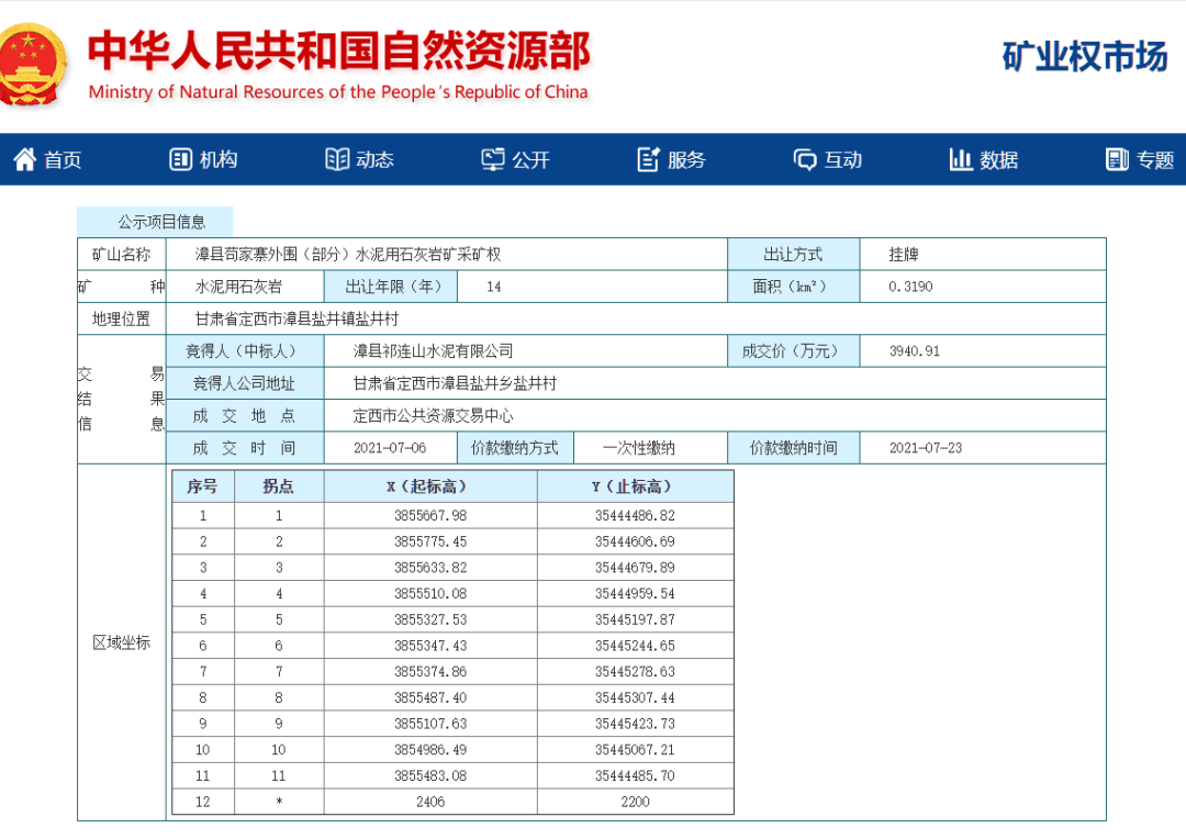 7月6日,漳縣祁連山水泥有限公司(甘肅祁連山水泥集團(tuán)股份有限公司)成功競得漳縣茍家寨外圍(部分)水泥用石灰?guī)r礦采礦權(quán),成交價(jià)格為3940.91萬元。該礦山位于甘肅省定西市漳縣鹽井鎮(zhèn)鹽井村,資源儲(chǔ)量達(dá)5103.16萬噸,擬出讓14年。