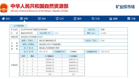 湖北京蘭建材有限公司3116萬元中標(biāo)一礦山9.2年采礦權(quán)