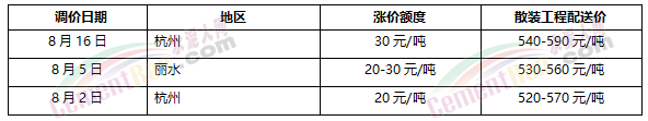 浙江省內(nèi)僅在8月初上調(diào)了部分區(qū)域水泥價(jià)格20-30元/噸,其中杭州地區(qū)兩輪連漲,累計(jì)上漲50元/噸,上調(diào)后PO42.5散裝工程配送價(jià)仍處在540-590元/噸。