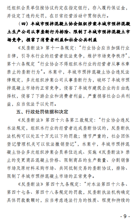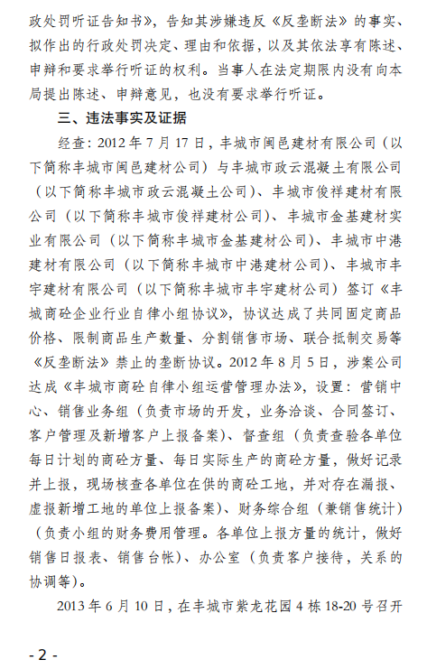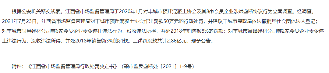 經(jīng)調查,2021年7月23日,江西省市場監(jiān)督管理局對豐城市預拌混凝土協(xié)會作出罰款50萬元的行政處罰,并建議豐城市民政局依法撤銷其社會團體法人登記;對豐城市閩邑建材公司等6家會員企業(yè)責令停止違法行為,沒收違法所得,并處2018年銷售額8%的罰款;對豐城市晨峰建材公司等2家會員企業(yè)責令停止違法行為,沒收違法所得,并處2018年銷售額3%的罰款。上述罰沒款共計2.86億元。
