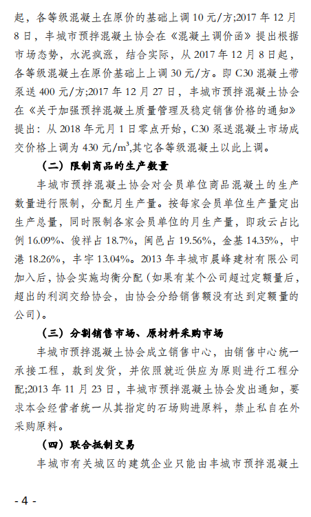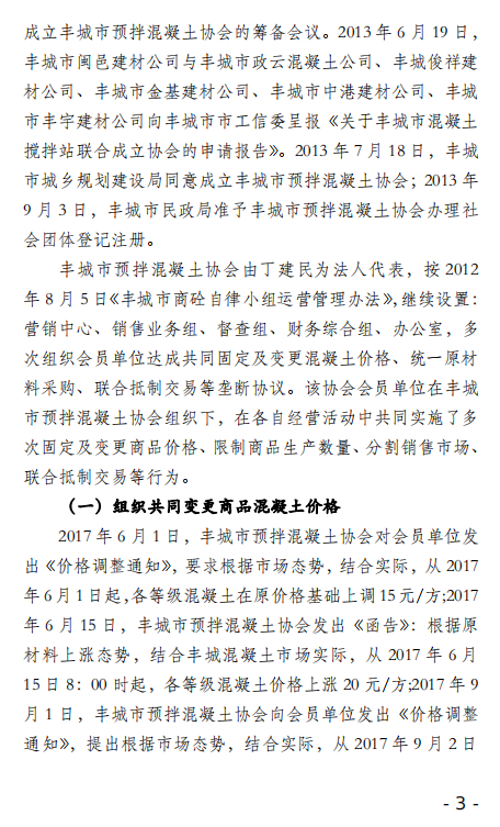 日前,江西省市場監(jiān)管局發(fā)布《豐城市預拌混凝土協(xié)會及其會員企業(yè)壟斷協(xié)議案的處罰決定》根據(jù)公安機關移交線索,江西省市場監(jiān)督管理局于2020年1月對豐城市預拌混凝土協(xié)會及其8家會員企業(yè)涉嫌壟斷協(xié)議行為立案調查。