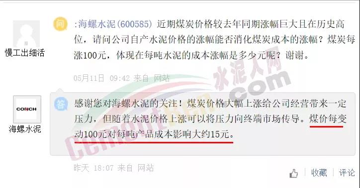 此前海螺水泥也曾在上市 平臺回復(fù)投資者稱,煤炭價格大幅上漲給公司經(jīng)營帶來一定壓力,但隨著水泥價格上漲可以將壓力向終端市場傳導(dǎo)。煤價每變動100元對每噸產(chǎn)品成本影響大約15元。