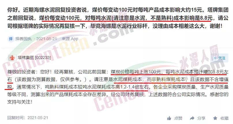 塔牌管理層則表示:煤炭價格每噸上漲100元,每噸水泥成本預(yù)計增加8.8元左右。且各企業(yè)采購煤炭質(zhì)量、生產(chǎn)水泥質(zhì)量等級不同,測算出來的產(chǎn)品煤耗成本會存在差異。
