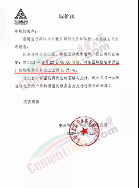 安康堯柏江華水泥有限公司通知,因原材料價格上漲,導(dǎo)致水泥成本增加。經(jīng)公司研究決定,自8月23日8時起,對各區(qū)域散裝水泥出廠價格在原價基礎(chǔ)上上調(diào)30元/噸。