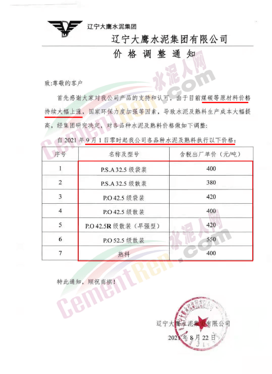日前,遼寧大鷹水泥集團有限公司通知,由于目前煤炭等原材料價格持續(xù)大幅上漲,國家環(huán)保力度加強等因素,導(dǎo)致水泥及熟料生產(chǎn)成本大幅提高,經(jīng)集團研究決定,自9月1日起公司各品種水泥及熟料執(zhí)行最新價格。其中P.O42.5散裝水泥和熟料均執(zhí)行400元/噸。P.O52.5散裝水泥執(zhí)行550元/噸。