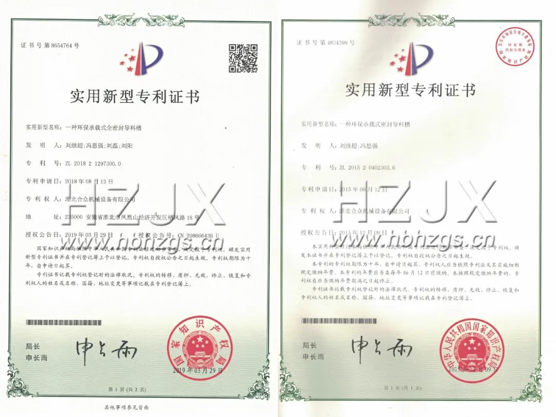此外,作為一家專注于智能環(huán)保輸送裝備粉塵治理的綜合性企業(yè),淮北合眾一直以來(lái)非常重視技術(shù)創(chuàng)新,其自主研發(fā)的“環(huán)保承載式全密封導(dǎo)料槽”榮獲由國(guó)家知識(shí)產(chǎn)權(quán)局頒發(fā)的兩項(xiàng)實(shí)用新型專利。