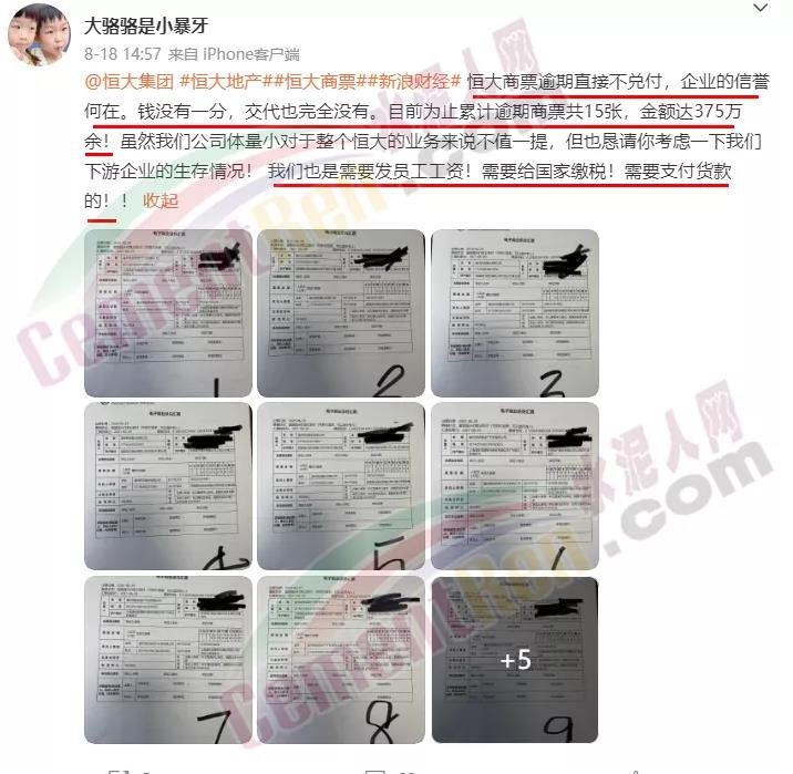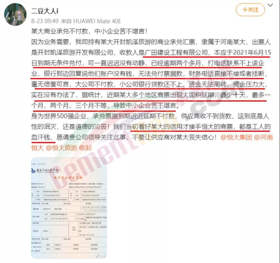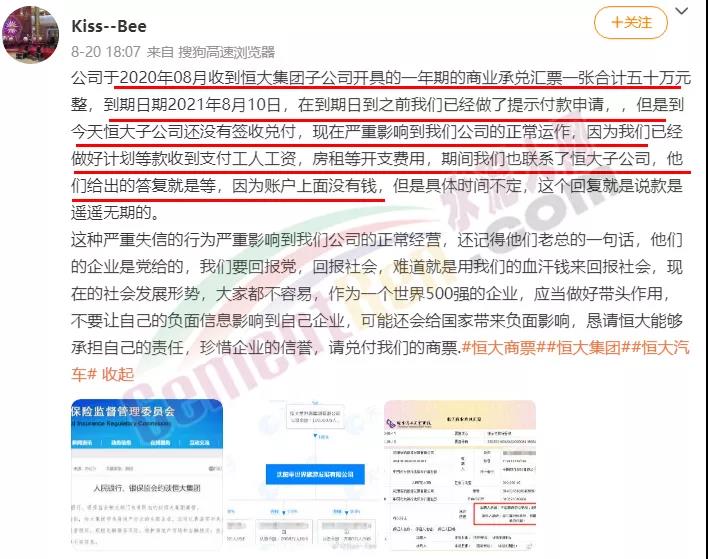 日前,網(wǎng)友“搬磚美少女1225”在社交平臺發(fā)布消息稱“我公司因業(yè)務往來收到由恒大地產(chǎn)集團簽發(fā)和承兌的銀行承兌匯票,作為票據(jù)權益合法持有人,按照《票據(jù)法》約定的到期提示付款,要求承兌人無條件進行兌付,結果遲遲不付款。工人等著工資寄回家,都上有老下有小,孩子即將開學也要支付學費等等…小微企業(yè)實在拖不起了”。