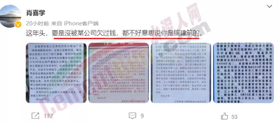另一微信名為“肖喜學”的網(wǎng)友調(diào)侃稱:要是沒被“某公司”欠過錢,都不好意思說自己是搞建筑的,附圖片羅列了幾份停工公告。