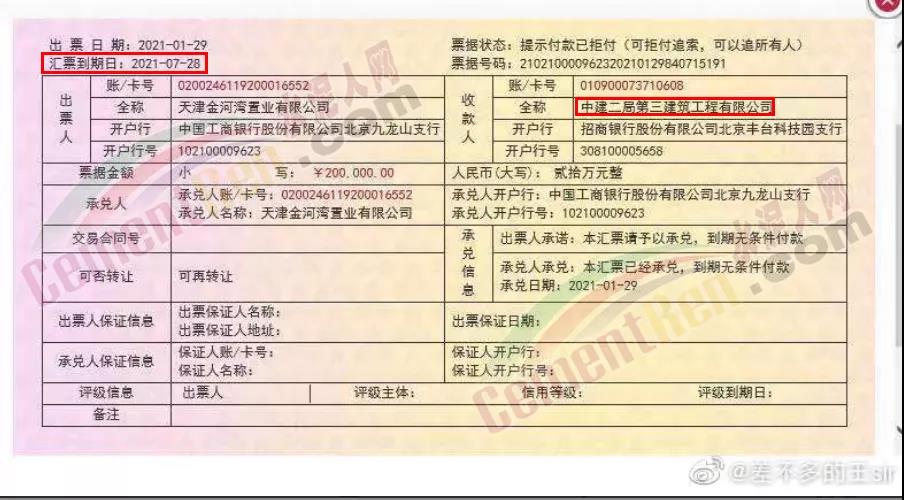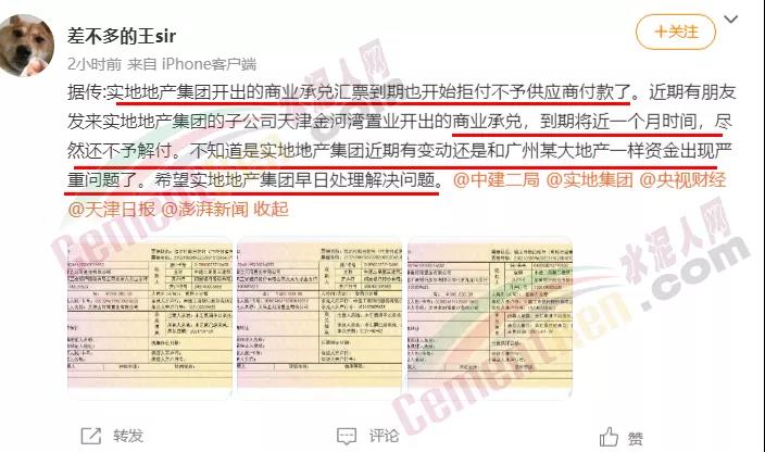 不僅恒大,另一名為“差不多的王sir”發(fā)消息稱“實地地產(chǎn)集團開出的商業(yè)承兌匯票到期也開始拒付不予供應商付款了。近期有朋友發(fā)來實地地產(chǎn)集團的子公司天津金河灣置業(yè)開出的商業(yè)承兌,到期將近一個月時間,竟然還不予解付。不知道是實地地產(chǎn)集團近期有變動還是和廣州某大地產(chǎn)一樣資金出現(xiàn)嚴重問題了。希望實地地產(chǎn)集團早日處理解決問題。”