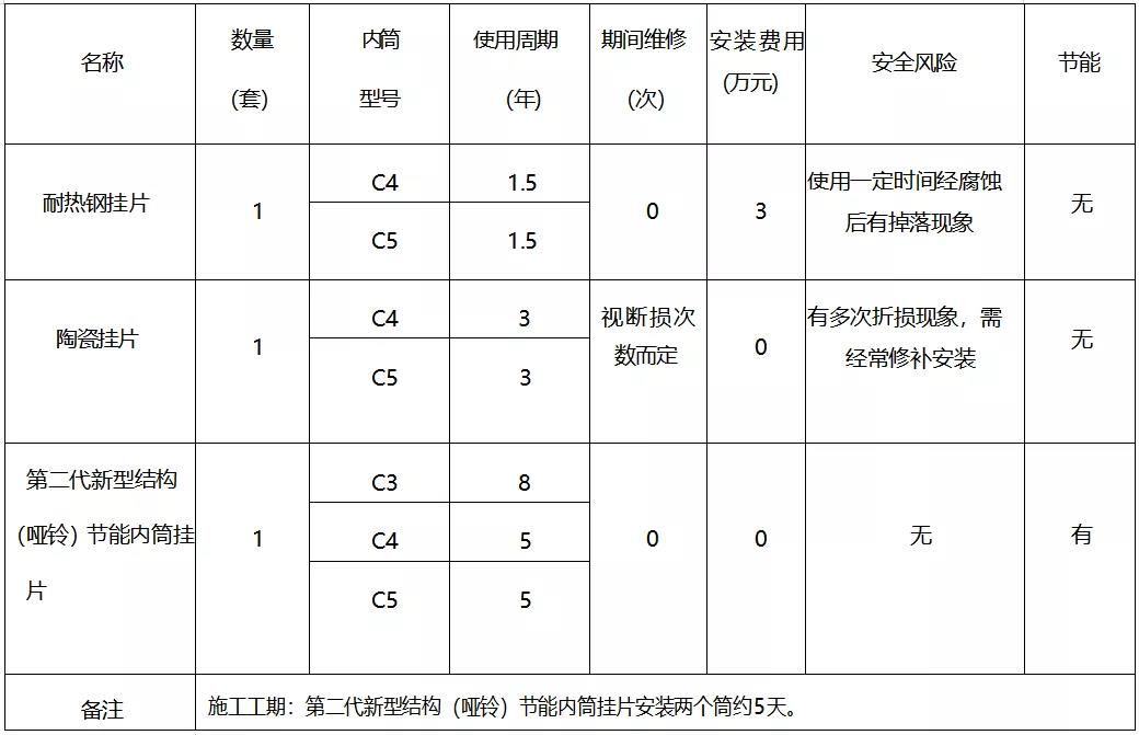 3、第二代新型結(jié)構(gòu)(啞鈴)節(jié)能內(nèi)筒掛片:采用金屬陶瓷構(gòu)架,經(jīng)內(nèi)外特種澆注料壓制及1400℃高溫燒制而成,正常使用情況下 C4、C5 內(nèi)筒質(zhì)保五年,C4實際壽命大于七年、C5實際壽命大于六年以上期間無需任何維修,具有密封性能好、耐磨性能強、耐高溫、耐腐蝕,且抗沖擊能力強、降低負壓有明顯的效果。