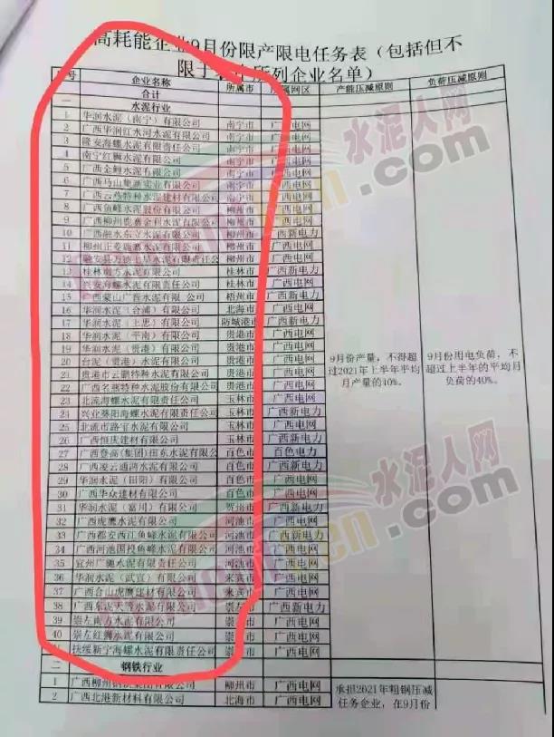 自治區(qū)將按旬實行節(jié)能調(diào)度,對于9月未完成限產(chǎn)任務(wù)進度或超過產(chǎn)品能耗限額的企業(yè),立即停止當月供電;對于未完成月限產(chǎn)任務(wù)的企業(yè),下月不再安排用電計劃。高耗能企業(yè)9月份限產(chǎn)限電任務(wù)表(包括但不限于表中所列企業(yè)名單)如下: